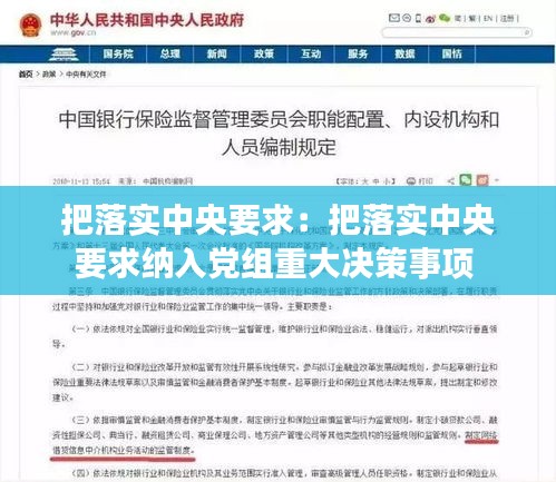 中央要求,即党中央对各级党组织和全体党员干部提出的具体工作要求和指导原则,是党和国家事业发展的重要指导方针。落实中央要求,对于确保党的路线方针政策得到全面贯彻,推动国家治理体系和治理能力现代化具有重要意义。在新时代背景下,把落实中央要求作为一项重要政治任务,对于加强党的领导,提高党的建设质量,确保国家长治久安具有深远影响。