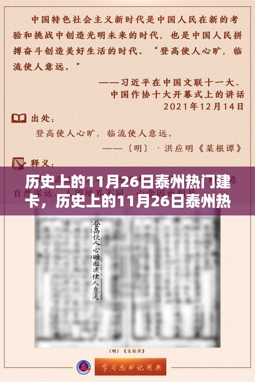 “历史上的11月26日泰州热门建卡”是一款集历史纪念、地域文化、实用工具于一体的特色产品,该建卡不仅展示了泰州地区在特定历史日期的重大事件和文化特色,还融合了现代科技手段,为用户提供便捷的服务体验,这款产品旨在通过融合历史文化和现代科技,增强用户对泰州地域文化的认知与归属感。