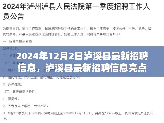 摘要:,,泸溪县最新招聘信息于2024年12月2日发布,本次招聘亮点解析包括多个领域的岗位空缺,为求职者提供了丰富的就业机会。招聘信息涵盖了各行各业,为泸溪县的发展注入了新的活力。本次招聘活动旨在吸引优秀人才,共同推动泸溪县的繁荣与进步。